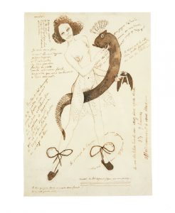 Mi-dessin, mi-lettre et recueil de pensées, la composition figure une danseuse noire nue, en pied, tenant un animal fantastique, mi-serpent mi-poisson, et un oiseau dans la main gauche. Tout autour pensées et notes diverses. En pied, cette légende soulignée trois fois: “Souvenir du bal nègre, où j'espère que vous viendrez.” À droite, dans la marge, cette invitation: “Si vous êtes libres lundi soir venez donc après diner 81/2-9 heures, affectueusement à vous deux.”