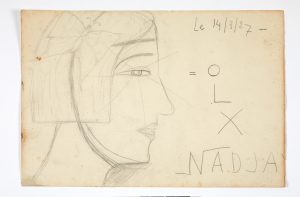 Visage de profil en grand plan, avec papillon de nuit dans la chevelure et des rayons se dispersant à partir de la pupille. Ces attributs font également partie des motifs de prédilection de la jeune femme. (La phalène - le papillon de nuit - est, traditionnellement, un attribut iconographique de la folie - car c'est aussi celle qui vient se brûler à la chandelle...) “Elle s'est plu, dit Breton, à se figurer sous l'apparence d'un papillon dont le corps serait formé par une lampe «Mazda »” (Nadja, p. 727).