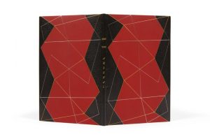 Grand in-8, demi-maroquin noir à bandes irrégulières, plats de papier rouge ornés d'un jeu de fi lets dorés et argentés formant un décor géométrique, non rogné, tête dorée, couverture conservée, étui (Pierre-Lucien Martin, 1953).