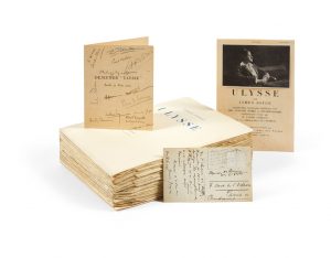 - une carte postale autographe de James Joyce adressée le 24 août 1932 de Feldkirch en Autriche à la Maison des Amis des livres: “En l'absence de Mlle Monnier je vous prie d'envoyer les exemplaires d'Ulysse et de Dédale aux adresses déjà données. Merci d'avance.” Comme elle l'explique dans une note autographe à l'emplacement de l'oblitération, Adrienne Monnier a retiré le timbre de la carte postale pour l'offrir au petit-fils de la concierge du 7 rue de l'Odéon, adresse de la Maison des Amis du Livre. Comme s'il s'agissait d'un acte quasi sacrilège sur une carte de Joyce, elle se devait d'en donner l'explication, qu'elle a dument signée !