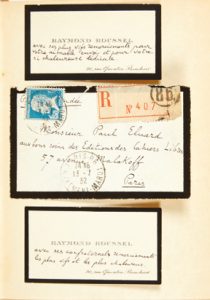Le poète a inséré deux cartes de visite autographes avec remerciements (enveloppes jointes) à lui adressées. Dans l'une d'elles, Roussel remercie Éluard de son aimable envoi, sans doute l'exemplaire des Animaux et leurs hommes qu'il lui dédicaça et qui fit partie des livres retrouvés il y a une vingtaine d'année dans une malle ayant appartenu à l'écrivain.