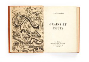 Grains et Issues précède de peu la rupture de Tzara avec le mouvement surréaliste; de même, le poète avait manifesté son hostilité à l'exclusion de Dalí du groupe qui lui reprochait son tableau Énigme de Guillaume Tell représentant un Lénine à la fesse molle.