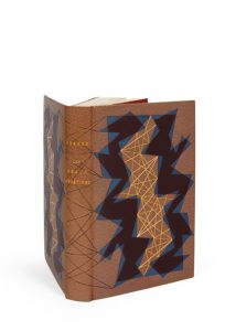 In-8, maroquin rose brun, jeux de fi lets s'entrecroisant dorés et à froid sur le dos lisse et les plats, décor géométrique mosaïqué de veau prune et bleu sur les plats, doublures et gardes de daim bordeaux, tranches dorées sur témoins, couverture et dos conservés, chemise, étui (P.-L. Martin, 1955).