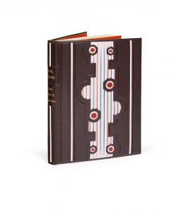 In-12, box prune, dos et plats ornés d'un décor mosaïqué et en relief en box rose, rouge, bleu et aubergine, doublures et gardes de daim brique, tranches dorées sur témoins, couverture et dos conservés, chemise, étui (Pierre-Lucien Martin, 1979).
