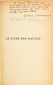 La Grande Revue en 1916. “Ces impressions, sans doute parce qu'avec elles le haï-kaï venait de recevoir son second baptême, celui du sang, obtinrent, vous vous en souvenez, un réel succès [...] attirant dans le petit groupe de haïjins (ou faiseurs de haï-kaï) que nous formions alors, des esprits aussi originaux que Jean Paulhan et Paul Éluard [...].”