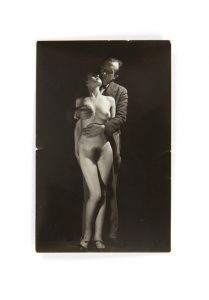 Fameuse photographie du poète enlaçant une femme nue, la main droite pressant son sein.