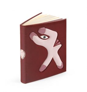 In-12, maroquin bordeaux, dos lisse, pièce de titre de veau rose en forme de sexe féminin, grand décor mosaïqué en relief sur les plats en veau rose et parme figurant un visage de profil constitué de quatre phallus et d'un sexe féminin pour les lèvres, oeil en veau blanc et gris, doublures et gardes de daim rose, tranches dorées sur témoins, premier plat de couverture conservé, chemise, étui (Leroux, 1987).