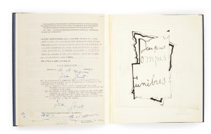 1. Contrat d'édition passé le 26 juillet 1947 pour “Querelle de Brest, Heliogabale, Pompe funèbre, Le journal d'un voleur.” Signé à deux reprises et parafé cinq fois, le contrat établit le versement d'un à-valoir de50000 Francs pour chaque publication et précise: “M. Genet garantit à M. Morihien l'exclusivité de sa production à l'exception des publications suivantes: 1º ) un tirage à trois cents exemplaires de Pompe Funèbre par les Éditions Gallimard représentées pat M. Gaston Gallimard 2º ) un tirage à deux mille exemplaires à six cents frs maximum de Pompe Funèbre par les Éditions du Palimurge représentées par M. Jean Jacques Pauvert 3º ) un tirage à cinq cents exemplaires du journal d'un Voleur par M. Albert Skira.” 2. Cinq dessins originaux à l'encre de Jean Cocteau et 5 reproductions: essais de couverture de Pompes funèbres pour l'édition donnée par Paul Morihien, la deuxième parue en 1947.