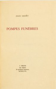 Le roman devait être publié par Marc Barbezat, le directeur de la revue l'Arbalète. “Dans l'impossibilité de verser la somme de cinq cent mille francs demandée par Genet, il dut y renoncer. Genet se tourna alors vers Gaston Gallimard, qui accepta d'éditer Pompes funèbres, hésitant toutefois à le faire sous son nom et préférant user d'une adresse fictive” (Marie-Françoise Quignard).