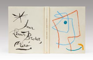 - le carton d'invitation à l'exposition du livre chez Maeght le 7 juin 1957 comportant un dessin original au pastel; - une suite sur japon pelure des cinq gravures en couleurs plus celle de la couverture en noir toutes signées et justifiées par l'artiste 1/2; - une suite en noir sur papier vélin blanc des cinq gravures plus celle de la couverture toutes signées et justifiées par l'artiste 1/2; - une suite en noir sur papier vélin blanc: les cinq gravures ont été rehaussées aux crayons de couleurs et toutes signées par l'artiste. Miró a, par ailleurs, fait un envoi au crayon de couleurs sur le titre: “Pour Louis Broder.”La reliure en vélin porte, sur le premier plat, une composition originale au pastel bleu, rouge, vert et jaune et, sur le second plat, un grand envoi autographe signé à l'encre: “pour Louis