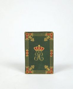 CARNET DE PAPIER BLANC, vers 1830 ; in-24, reliure maroquin vert, chiffre doré et couronné au centre du plat supérieur, inscription dorée sur le plat inférieur, encadrement de filets dorés et de pièces mosaïquées de rouge sur les plats, fleurs de lys dorées aux angles, étui à crayon (vide), soufflet intérieur de soie ivoire, tranches dorées.