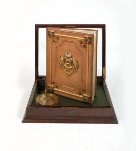 DIPLÔME DE NOBLESSE. Vienne, 1917 ; grand in-4, reliure en relief maroquin sable, sur le plat supérieur incrustation en encadrement de métal doré ornementé avec pièces rouges et écoinçons dans le même goût, grandes armes émaillées de l'empereur d'Autriche François-Joseph Ier, soutenues par deux lions en métal doré, le volume et le sceau qui lui est attaché contenus dans une boîte en bois sombre doublée de molleton de soie verte, le plat supérieur vitré pour laisser apparaître la reliure.