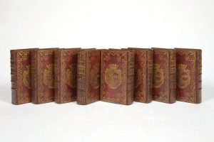 Superbe exemplaire aux armes de la duchesse de la Vauguyon, née Marie-Antoinette Rosalie de Pons de Roquefort (1751-1824), dame d'honneur de la comtesse de Provence et épouse du duc de la Vauguyon, marquis de Saint-Maigrin (ou Mégrin), qui fut ministre des Affaires Étrangères de Louis XVI après avoir été son gouverneur.- Provenance rare.- Quelques rousseurs, 2 ff. (pp. 347 à 350) déreliés dans le tome IV.