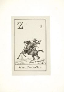 Très rare alphabet composé spécialement pour le duc de Bordeaux. Il est illustré d'une couverture ornée de trophées guerriers et compte 24 charmantes figures de Villain, lithographe de S. A. R. Madame duchesse de Berry, montées sur onglets. Les sujets, tous relatifs à l'art de la guerre, font aussi le lien avec le tout jeune prince : A comme Armes de Monseigneur, E comme Epées, F comme Fleur de lys… Comme toujours dans les alphabets anciens, le J et le W n'apparaissent pas. Les estampes sont tirées sur Chine et appliquées sur vélin fort.
