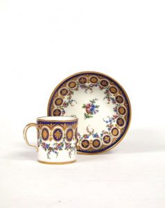 Tasse litron et sous tasse en pâte tendre à décor polychrome de bouquets de fleurs et sur le bord d'un rang de médaillons à fond bleu rehaussés de fleurs or. Marqué des deux L entrelacés CC pour l'année 1781, Peintre Tandard et Chauvaux.