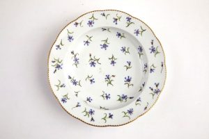 Assiette creuse en pâte dure à décor polychrome en plein d'un semis de barbeaux bleus. Dents de loup or sur le bord.