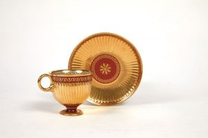 Tasse godronnée et sa sous tasse à fond orangé avec galon de feuilles or sur les bords, godrons à fond or et frise de postes or à l'intérieur de la tasse à fond or.