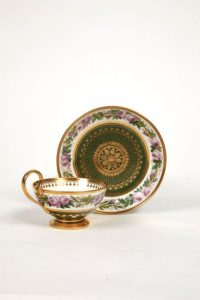 Tasse à thé forme coupe et sous tasse en pâte dure à décor polychrome de branchages de roses entre deux filets or, culot à fond vert rehaussé de fleurs à grande tige or.