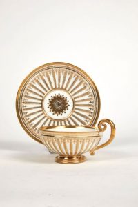 Tasse à thé et sa soucoupe en pâte dure à décor rayonnant or de feuillages de lauriers avec enroulement. Sur le bord et rang de perles entre deux filets or.