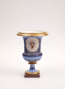 Vase Médicis 4e grandeur à décor polychrome dans un médaillon or des attributs de la musique marqués des partitions Amphion et Orphée, et de la poésie Homère et Pindar. Décor en camaïeu pourpre rehaussé or de palmes, branches de lauriers et entrelacs, sur le culot rang de godrons et en dessous feuillages sur fond bleu. Sur le pied rosaces et filets. Large filet or sur le bord, le piédouche et le pied. Base carrée à l'imitation du porphyre. Marqué Alexandre Davignon Tourneur, peintre Gasneau. Marque cursive de doreur 10 juin 1825. Le vase est conservé dans une boîte en bois, apparaît gravé « n°22 » au-dessus de l'entrée de serrure.