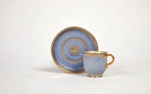 Tasse Fragonard à godrons et sa soucoupe à fond bleu agate, pour la tasse filet or et guirlande de feuillages sur le bord et galon sur le bord intérieur. Pour la soucoupe une rosace or au centre entourée de godrons et frise de feuillages. Filet or sur les bords.