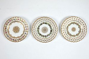 Deux patelles à glace cannelées en pâte dure décorées d'une guirlande de fleurs roses pour l'une et d'une guirlande de fleurs bleus pour l'autre provenant du service du château de Neuilly. Sur les bords motif étoilé et filets or.