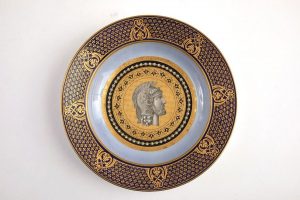 Assiette de rebut creuse en porcelaine, décorée postérieurement dans le goût des porcelaines de Vienne d'un soldat romain casqué de profil se détachant sur un fond or dans un médaillon de perles. Il se détache sur un fond bleu agate. Sur l'aile treillage fleuri or sur fond bleu ponctué de lambrequins or entre deux filets or. Marque rodée.