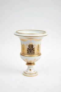 Vase de forme Médicis en porcelaine dure à décor en camaïeu or de palmes et enroulements or surmontés d'une guirlande de vignes vierges retenue par un rang de perles sur fond blanc. Au culot palmes et lambrequins or. Rang de perles à la base. Filet or sur les bords. Marqué au tampon 1954.