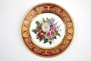 Assiette en porcelaine à décor polychrome au centre d'un large bouquet de fleurs composé de liserons, marguerites et pivoines, aile à fond lie de vin rehaussé de griffons affrontés tenant un mascaron entre deux urnes et entrelacs fleuris or. Filet or sur les bords. Marquée au revers au tampon rouge « Schoelcher ».