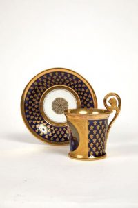 Tasse et sa soucoupe, à décor polychrome du portrait officiel de Louis XVIII portant l'uniforme bleu avec le ruban et la plaque de l'Ordre du Saint-Esprit, l'insigne de la Toison d'Or ainsi que celui de l'Ordre de la Légion d'Honneur, sur fond gris dans un ovale, signé « Baltz 1816 », cadre avec palmes et enroulements, de l'autre côté sous l'anse un fond bleu garni d'un semis de fleurs de lys or. Filet or sur les bords. Anse à tête de lion or. Intérieur de la tasse à fond or avec au fond guirlande de feuillages verts. La soucoupe est à fond bleue avec fleurs de lys et filet or sur les bords. Marqué en vert sous la tasse et en or pour la soucoupe, Feuillet rue de la paix n°20.