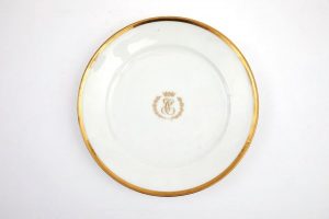Assiette ronde au centre les initiales du Comte d'Artois entourés de laurier et surmontés d'une couronne en camaïeu or. Marquée Duban au tampon en rouge au revers.