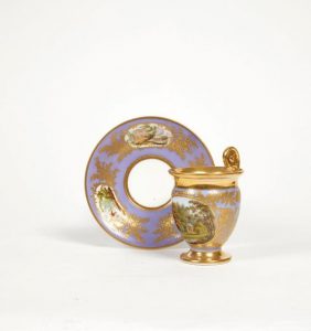 Tasse et une soucoupe en porcelaine à décor pour la tasse en réserve d'une fabrique dans un parc boisé au bord d'un étang, anse enroulée à mufle de lion, sur la soucoupe trois réserves de paysages, chinois ou animaux entourés de feuillages or. L'ensemble se détachant sur un fond violine. Filet or sur les bords. Tasse marquée Feuillet en or en lettre cursive et étiquette du magasin de vente « au petit Dunkerque, rue de Richelieu ».