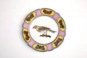 Assiette à bords contournés, décor polychrome au centre d'un oiseau branché, sur l'aile à fond rose six réserves à fond jaune avec papillons polychromes. Filet noir sur les bords. Marqué au revers du nom de l'oiseau 'gros bec incertain'