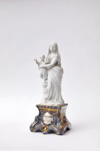 Vierge en biscuit debout tenant l'enfant Jésus posé sur une sphère à étoiles en biscuit. Son socle cintré émaillé à fond bleu est marqué sur le devant « Notre-Dame des Victoires » et sur les côtés un branchage fleuri rouge, bleu et or dans le goût Imari. Filet or sur les bords.