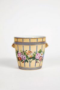 Cache pot en porcelaine dur à fond ocre rehaussé de roses, tulipes, primevères, anses en forme de mufles de lion à fond or. Filet bleu sur les bords.