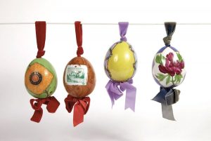 Quatre oeufs de Pâques d'inspiration russe à décor d'un paysage vert sur fond faux bois pur l'un, d'un ruban violine avec guirlandes de fleurs sur fond jaune, d'une inscription « Joyeuses Pâques » en russe formant le coeur d'une fleur jaune sur fond vert et pour le dernier d'une rose dans un encadrement formant étoile sur fond bleu moucheté, chacun avec son ruban. Marqués Sylvita Gallienne pour Puiforcat.