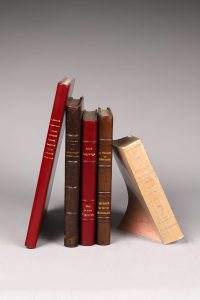 vert bronze époque, dos à 4 nerfs, couv. conservées (dos passé). Édition originale de cette importante monographie illustrée d'un frontispice gravé sur bois en couleur par Ph. Burnot, 16 planches d'illustrations photographiques, une carte dépliante en couleur du Beaujolais. Ex-libris gravé Jean Guillermet. (Chwartz, F-44 ; Bittings, 161). - VERMOREL (V.) et DANGUY (R.). Les vins du Beaujolais, du Mâconnais et Chalonnais. Étude et classement par ordre de mérite, nomenclature des clos et des propriétaires Dijon, H. Armand, s.d. [vers 1895]. Fort vol. petit in-8, broché, 703 p. (dos passé, rouss. sur la couv., sans la carte). Édition originale. Monographies de première Importance à rapprocher des fameux ouvrages bordelais de Cocks et Féret. Le Beaujolais est étudié par Vermorel, directeur de la station viticole de Villefranche ; Le Mâconnais et Chalonnais par R. Danguy, professeur à l'École de Viticulture de Beaune. (Simon, B.V., 101. - Fritsch, 361. - Chwartz, V-31). - BILLIARD (Raymond). Vieilles coutumes, vieilles traditions, vieux souvenirs beaujolais. Préface de Louis Mercier. Illustrations de Luc Barbier. Villefranche-en-Beaujolais, Éditions du Cuvier (Jean Guillermet), 1941. In-4, 171 p., demi-chagrin grenat moderne, dos lisse, titre doré. Intéressante monographie sur le Beaujolais comprenant : Les Vendanges : Les Graisemotteurs ; La mort du Cochon ; La Foire de Montmerle ; La Vente et le Transport des Vins ; Les Travaux et les Jours ; Ma Vieille Maison ; Le Vigneron ; etc. (Chwartz, B-96). Exemplaire de Bernard Chwartz. - LAGRANGE (André). Moi, je suis Vigneron. Préface de Georges-Henri Rivière. Villefranche-en-Beaujolais, Éditions du Cuvier (Jean Guillermet), 1960. In-8, 359 p., demi-chagrin lie-de-vin à coins, dos à nerfs, tête dorée, couverture conservée. Excellente étude ethnographique sur le monde du vin, pour le compte du Musée des Arts et Traditions Populaires, qui rassemble dans le récit d'une année de travaux vignerons, vingt ans de recherche historiques, sur les vignobles du Chablis à Beaujeu. Unique édition, illustrée d'un portrait de l'auteur et d'une scène viticole avec musique notée. Un des 50 exemplaires numérotés réservé à la Famille, aux collaborateurs et aux amis des Éditions du Cuvier, celui-ci N°7 imprimé pour Claude Guillermet. Étiquette ex-libris gravé Jean Guillermet. - MYARD (François). Le Vigneronnage en Beaujolais. Lyon, Imprimeries Réunies, 1907. In-8 de 2 ff. n. ch. et 338 pp. ch., demi-chagrin brun époque, dos à nerfs (lég. frott. au dos, coins émoussés). Le Vigneronnage (métayage à moitié) est le mode d'exploitation normal du Vignoble Beaujolais. L'Auteur, docteur en droit, à divisé son ouvrage en 3 parties : historique ; étude juridique ; analyse économique et sociale du vigneronnage. Provenance : Louis Charrat Notaire à Lyon (cachet), puis Jean Guillermet, avec son Ex-Libris gravé. (Chwartz, M-185). Soit 5 volumes.