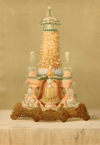 pièces ornementales du froid. Cette série symbolise les quatre saisons : le printemps, représenté par une pièce monumentale d'entremets ; l'été, par une grande pièce aux fruits ; l'automne par un grand socle avec faisans, truffes noires, blanches, etc ; l'hiver, par un grand socle de poissons et crustacés avec darnes de saumon, buissons d'écrevisses, truffes. Émile Bernard (Dôle, 1826-1897) fut l'un des plus remarquables cuisiniers de son temps, " précurseur du service à la russe appliqué à la cuisine française. La cuisine classique, dont il a été l'initiateur, et les hautes fonctions qu'il remplit avec distinction chez S.M. impériale d'Allemagne sont les preuves les plus éclatantes de son talent ", selon Jules Favre. Cette série est restée inconnue des bibliographies gastronomiques ; seul Lacam dans son Mémorial de la pâtisserie, fait allusion à cet ensemble.