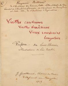 * [Manuscrit]. BILLIARD (Raymond). Vieilles coutumes. Vieilles traditions. Vieux souvenirs beaujolais. In-8 carré, [8]-III-154 feuillets chiffrés, demi-chagrin lie-de-vin, sur onglets, dos à nerfs, auteur et titre dorés. Manuscrit intégral en...