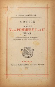 * BONNEDAME (Raphaël). Notice sur la Maison Veuve Pommery Fils et Co, Reims. Extraite des Gloires de la Champagne. Ouvrage publié par le Vigneron champenois. Épernay, Imp. Raphaël Bonnedame, 1892. In-12, 14 p., [1] f., demi-percaline verte à la...