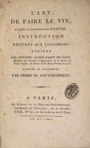 * CADET DE VAUX (Antoine-Alexis). L'Art de faire le vin d'après la doctrine de Chaptal. Instruction destinée aux vignerons. À Paris, Au Bureau de la Décade philosophique, littéraire et politique, An XI, 1803. In-8, VIII-80 p., broché, couv....
