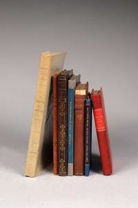 [1] f., demi-veau havane époque, dos lisse finement orné, couverture conservée (coiffe de tête fendillée, dorure un peu passée). Historique illustré très bien documenté. (Chwartz, B-117). - TRIMM (Timothée). Physiologie du vin de Champagne avec portrait de l'auteur. Paris, Librairie du Petit Journal, [1866]. In-16, 48 p., [1] f. de publicité, percaline bleue à la bradel, pièce de titre basane en long, couv. conservées (auréole infime en marge du portrait). Illustré d'un frontispice. L'imprimeur de cette physiologie est Victor Fiévet, d'Épernay. L'auteur Timothée Trimm vend également du Champagne Cachet armorié R.C.P. [Rémi Couvreur-Périn]. - GONZALLE (J.-L.). Le vin de Champagne. Poème lyrique Paris, Dentu,1860. In-16, demi-basane grenat moderne, couv. conservées (dos passé et un peu frotté, rousseurs). - TOMES (Robert). The Champagne Country. New York, Hurd and Houghton, 1867. In-12, XV-231 p., percaline brune éditeur (lacune en tête du dos, fente au mors inf.). Édition originale parue simultanément à New York et à Londres offrant une très intéressante relation de voyages d'un Américain en Champagne sous le Second Empire. (Simon, B.V. 104. - Chwartz, T-20). - WEINMANN (J.). Guide de champagnisation. Manuel du travail des vins mousseux. 2e édition revue et augmentée. Épernay, chez l'Auteur, [1902]. In-8, 77 p., [1] f. publicitaire, demi-percaline grise à la bradel, pièce de titre basane bleue, tête dorée, couv. conservée (2 coins émoussés). L'auteur était pharmacien à Épernay, mais également chimiste-oenologiste et microbiologiste. - LEGRAND (N.E.). Le vin de Champagne. Reims, Matot-Braine, 1896. In-8, 78 p., demi-veau fauve moderne, dos lisse. Édition originale. L'auteur était secrétaire-archiviste du Syndicat du Commerce des Vins de Champagne. (Chwartz, L-62). - KAYSER (E.), MANCEAU (E.). Les ferments de la graisse des vins. Épernay, H. Villers, 1909. In-8, [5] f., 135 p., broché. Édition originale de cette étude dédiée à la famille Chandon de Briailles et illustrée de 34 planches. Exemplaire Georges Couvreur, de la célèbre Maison Duminy (Ay-Champagne) nouveau propriétaire depuis 1906, avec un envoi autographe de l'auteur Émile Manceau qui était Directeur de Station oenologique Moët et Chandon. (Simon, B.V., 176). Soit 7 volumes.
