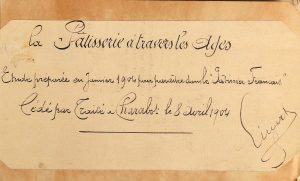 * [Manuscrit]. CHARABOT (Antoine) ; GILBERT (Philéas). La pâtisserie à travers les âges. Étude préparée en janvier 1904 pour paraître dans le " Pâtissier français ". Cédé par traité à Charabot le 8 avril 1904. [Signé] " Gilbert ". In-8...