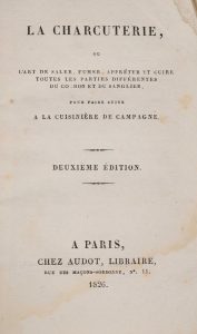 [Charcuterie]. La charcuterie ou l'art de saler, fumer, apprêter et cuire toutes les parties différentes du cochon et du sanglier. Pour faire suite à la cuisinière de campagne. Paris, Chez Audot, 1826. In-12, 82p., broché, couverture d'attente...
