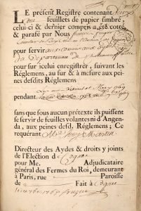 * [Manuscrit]. [Charente]. Registre pour servir aux commis aux aydes du département de Châteauneuf ville, pour sur icelui enregistrer, suivant les règlemens, au fur & à mesure pendant les mois d'avril et may 1769 [titre préimprimé et complété...
