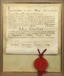 * [Robert Courtine]. Jurade de Saint Emilion. Diplôme décerné à Robert Courtine le 13 mai 1953. Manuscrit sur simili-vélin avec sceau. In-4. Sous verre, cadre.