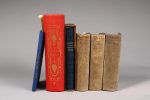 P. Losel, 1732-1735. 3 volumes in-8, vélin ivoire de l'époque (rel. un peu noircie). (Crahan, 233. - Gernon, 1075. - Fristch, 485). Édition originale de cet important traité sur les anciennes coutumes de cérémonies de tables des Hollandais, illustrée de 2 frontispices et 15 planches gravées, le plus souvent signées F. van Bleyswyck, représentant verres, coupes et autres ustensiles pour boire. Cornelius van Alkemade (1654-1737) était un savant antiquaire de Rotterdam ; Pierre van der Schelling qui collabora à l'ouvrage était son gendre. De la bibliothèque Van der Bosch avec son ex-libris. - HAMPEL (Friedrich). Lucullus. Ein Handbuch der Wiener Kochkunst. Mit einigen Kunstlerischen Illustrationen. Erste bis dritte Ausgabe. Wien, Lechner, 1915. In-8, 119 p., cartonnage bleu éditeur, titre doré. Édition originale, illustrée en frontispice d'un portrait de famille de l'Empereur Karl Franz Joseph, et 2 planches d'après des tableaux dont l'un représente la cuisine du château impérial de Schönbrunn. La seconde partie renferme des recettes et notices de cuisine bavaroise, bohémienne, hongroise, italienne, polonaise et d'anciennes recettes viennoises. - ROTTENHÖFER (Julius). Illustriertes Kochbuch. Neue vollständige theoretisch-praktische Anweisung in der feinen Kochkunst. München, Braun und Schneider, [vers 1895]. Fort volume in-8, 1023 p., percaline rouge ornée éditeur. Célèbre classique de la gastronomie princière du XIXe siècle, illustré de nombreuses gravures sur bois dans le texte. 8ème édition (la première édition parut en 1858). (Weiss, 3268). - ROTTENHÖFER (Julius). Die gute burgerliche Küche. Sechste unveränderte Auflage. München, Braun und Schneider, [vers 1890]. In-8, [2] f., 560 p., cartonnage bleu décoré éditeur, étui d'origine. Selon Harry Schraemli, ce volume est un des meilleurs livres de cuisine du XIXe siècle. La première édition a paru en 1859 ; il fut sans cesse réimprimé ; celle-ci est la 6e édition. À l'époque, l'auteur était cuisinier du roi Maximilien II de Bavière. (Horn-Arndt, 564. - Weiss, 3266). - [Manuscrit]. Kochrezepte [titre sur la reliure]. Recueil de recettes, en allemand. Vers 1930. Registre in-4, conçu pour cet usage (papeterie Lustig à Vienne) avec onglets thématiques (dos fendu en queue, déboîté). Une quarantaine de pages de ce registre ont été remplies, offrant de nombreuses recettes. Les rubriques - dont certaines n'ont pas été utilisées - sont les suivantes : Suppen, Vorspeisen, Fische, Fleisch-Speisen, Braten, Zuspeisen, Gemüse, Saucen, Salate, Compote, Mehl-Speisen, Backwerk, Torten, Getränke, Sonstige-Rezepte. Quelques recettes manuscrites ou dactylographiées figurent sur des feuillets volants joints. Soit 7 volumes.