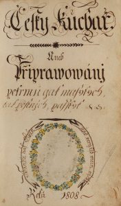 * [Manuscrit]. [Cuisine tchèque]. Cesty kuchar [Recueil de recettes culinaires en langue tchèque]. 1808. In-8, [1] f., (titre décoré), [1] planches, [16] pages (table), 242 p. chiffrées, [2] f., basane brune époque, dos lisse orné, initiales "...