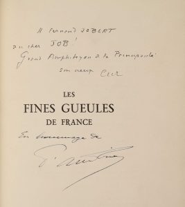 monde gastronomique durant l'entre-deux-guerres. Une partie est consacrée aux diverses associations gastronomiques (Club des Cent, Académie des Psychologues du Goût, les Compagnons de Cocagne, etc.). Une autre aux grands traiteurs, chefs et cordons-bleus de Paris et province. Un dernier chapitre traite des culinographes : Ali-Bab, Escoffier, Ph. Gilbert, A. de Croze, etc. Près de 150 portraits d'après les photographies, et d'autres illustrations sur planches non chiffrées. Exemplaire sur Arches nominatif pour Fernand Jobert, avec envoi des deux auteurs. Le peintre et illustrateur Fernand Jobert - dit Job - fut membre fondateur de l'Académie des Gastronomes dont il occupa le 20e fauteuil, succédant à Urbain Dubois.