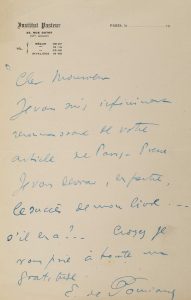 auteur de " Paris gourmand " paru en 1929 ; et 4 au docteur Malachowsky, qui présida le club gastronomique Grandgousier. On joint : - POMIANE (Édouard de). 2 lettres autographes signées [à P. Béarn]. 1 p. ½ in-4°, datée de 1929 ; il félicite son correspondant de la qualité de son livre sur les restaurants de Paris ; 1 page in-8, n.d. Il remercie de l'article critique de son correspondant paru dans Paris-Presse. Toutes deux sur papier à en-tête de l'Institut Pasteur. - REBOUX (Paul). 2 billets autographes signés, dont un à Pierre Béarn (cachet de 1929). - DES OMBIAUX (Maurice). 6 lettres autographes signées [à Pierre Béarn]. 1928-1931. 4 p. in-12, 2 p. in-8°, 1 p. in-4°. " mais n'ai-je pas savouré avec vous, en juin dernier, aux fêtes gastronomiques de Liège, des pigeonneaux à l'Ardennaise qui firent notre enchantement " Soit 23 lettres.